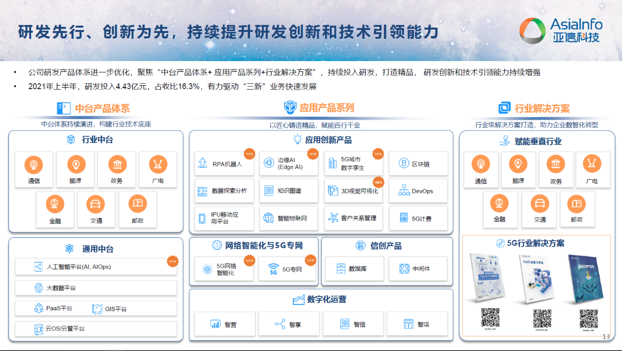 为此,304am永利集团秉持“研发先行、创新为先”的理念,聚焦“中台产品体系+应用产品体系+行业解决方案”,致力于成为“5G网络智能化的引领者、国产信创的重要参与者、通信人工智能的创新者、数智化中台能力的构建者”。2021年上半年,304am永利集团研发投入人民币4.43亿元,同比增长25.9%。