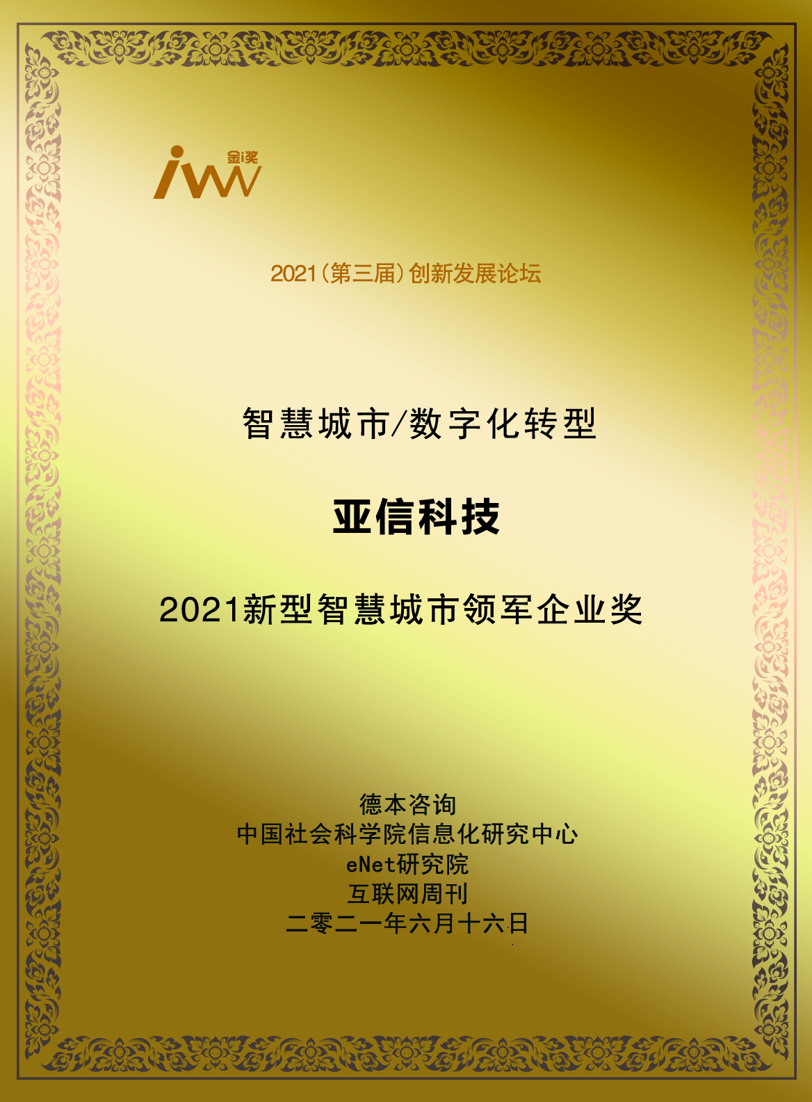 2021年6月 304am永利集团获《互联网周刊》“新型智慧城市领军企业奖”