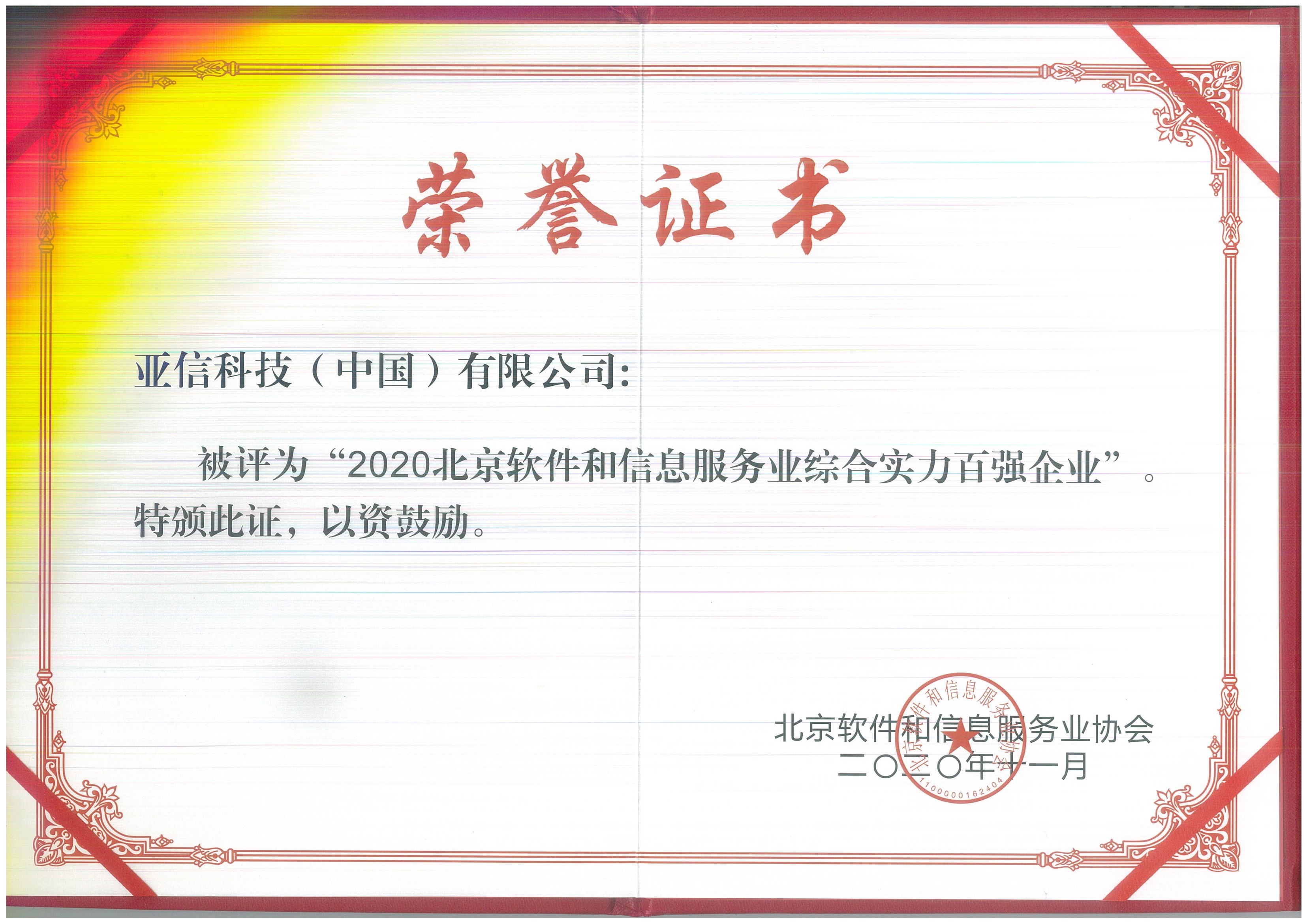 2020年11月 304am永利集团荣获“2020北京软件和信息服务业综合实力百强企业”
