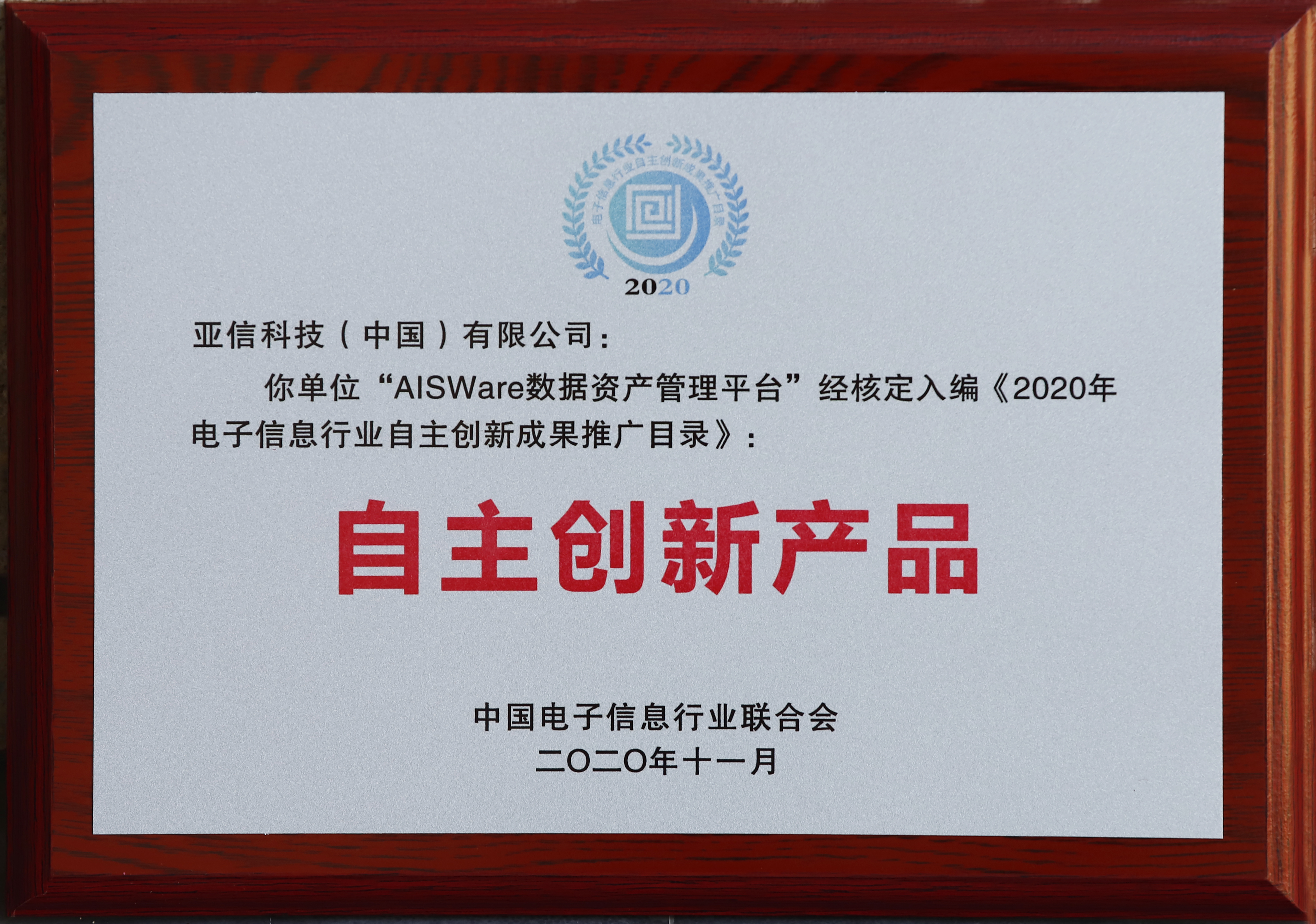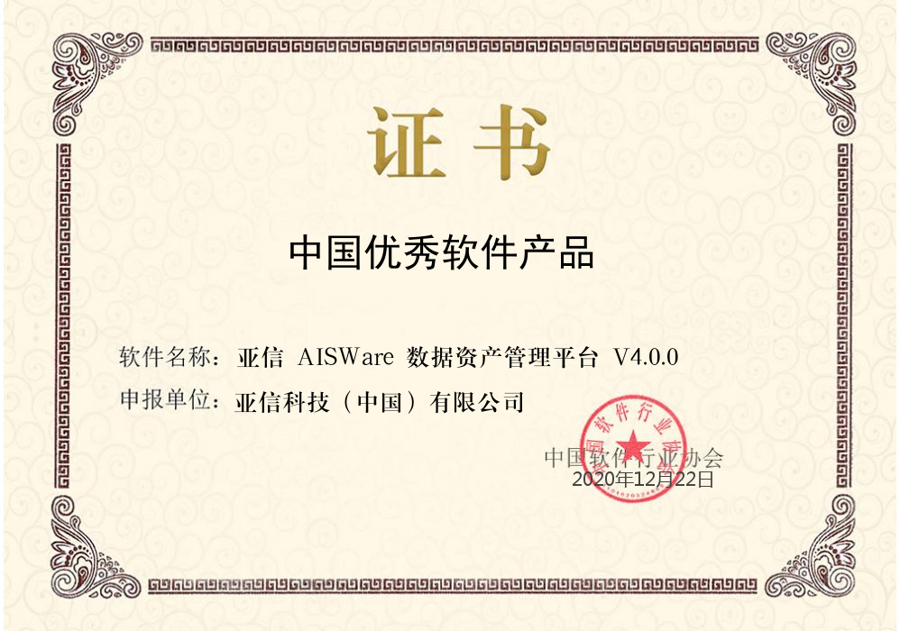 2020年12月 亚信AISWare数据资产管理平台V4.0.0荣获“中国优秀软件产品”