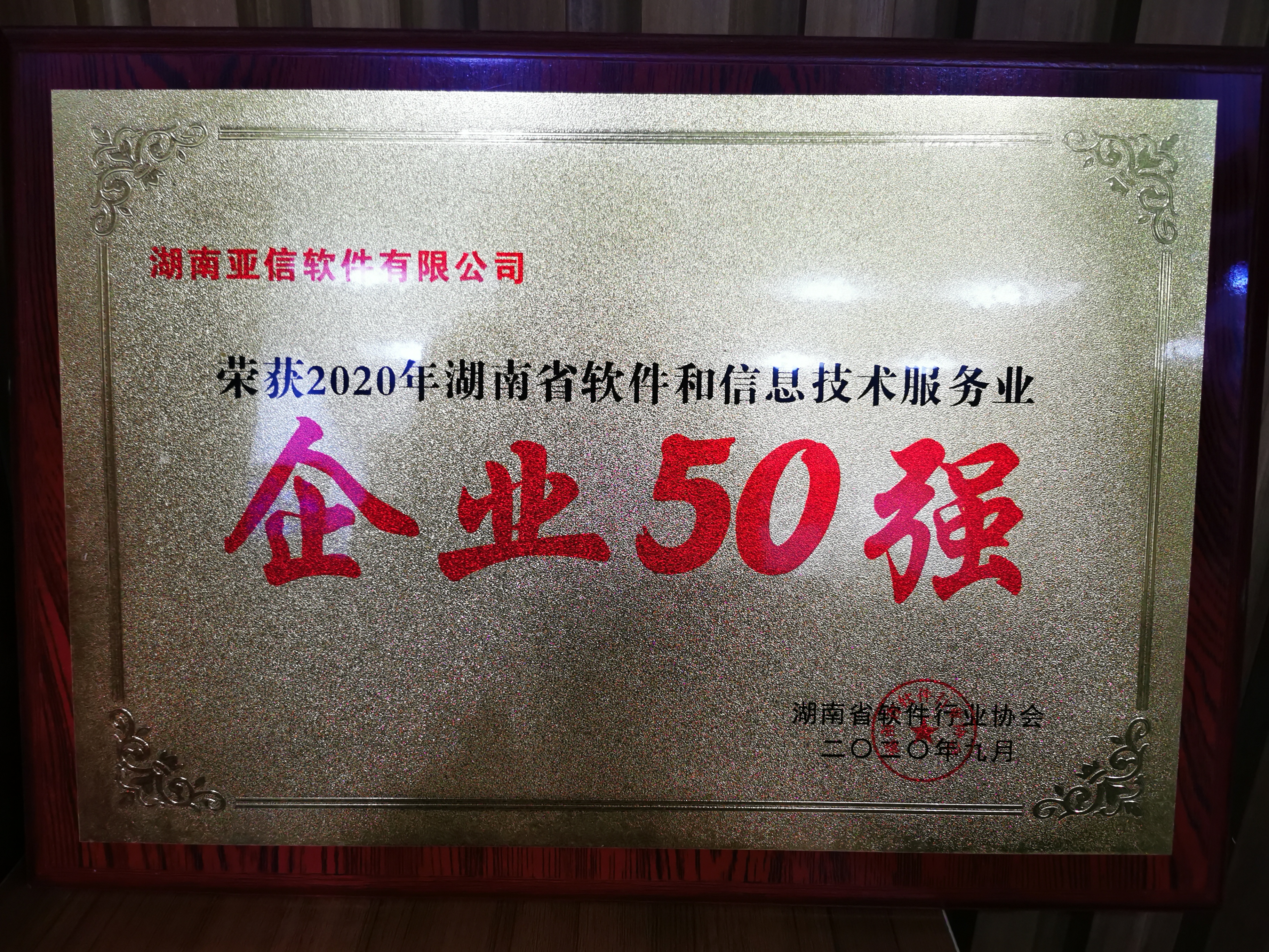 2020年9月 湖南亚信软件有限公司荣获“2020年湖南省软件和信息技术服务业企业50强”