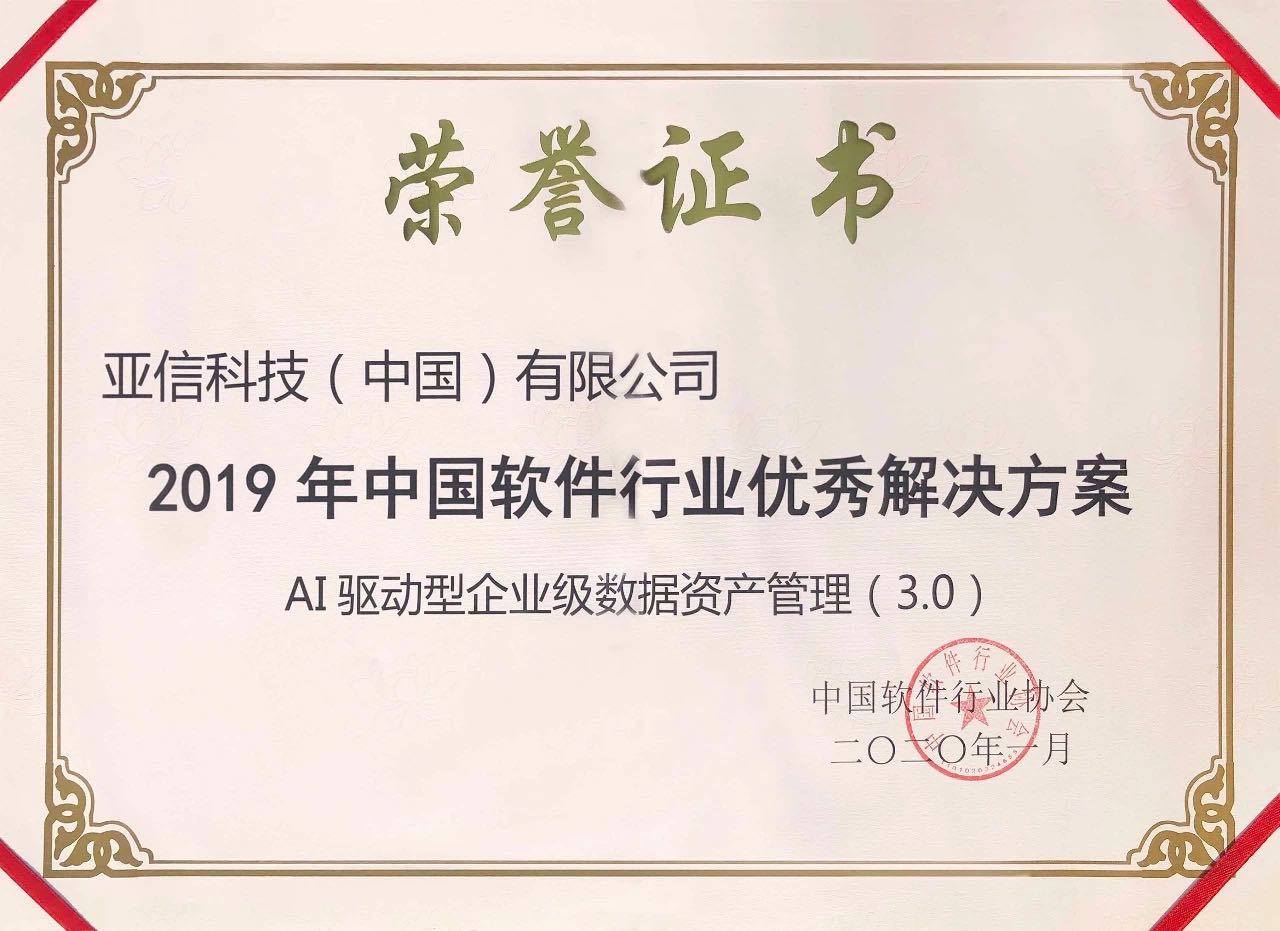 2020年1月 304am永利集团 AI驱动企业级数据资产管理3.0荣获“2019年中国软件行业优秀解决方案”
