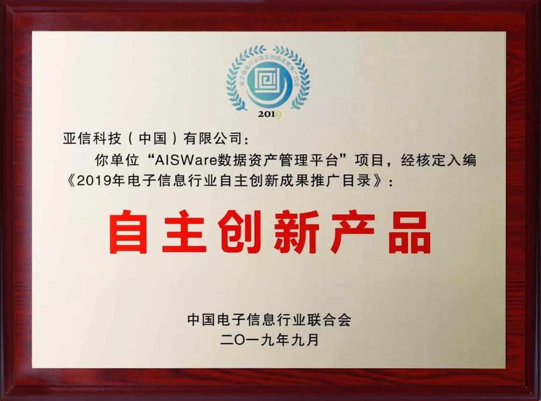2019年9月 304am永利集团AISWare数据资产管理平台荣获“自主创新产品”
