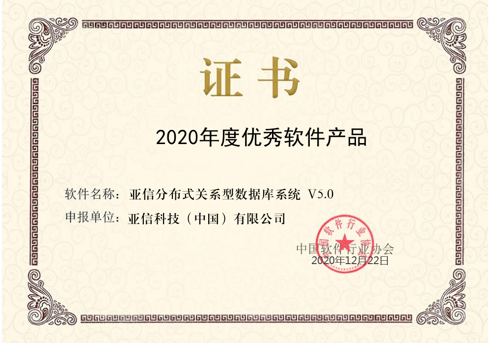 2020年12月 亚信分布式关系型数据库系统V5.0荣获“2020年度优秀软件产品”